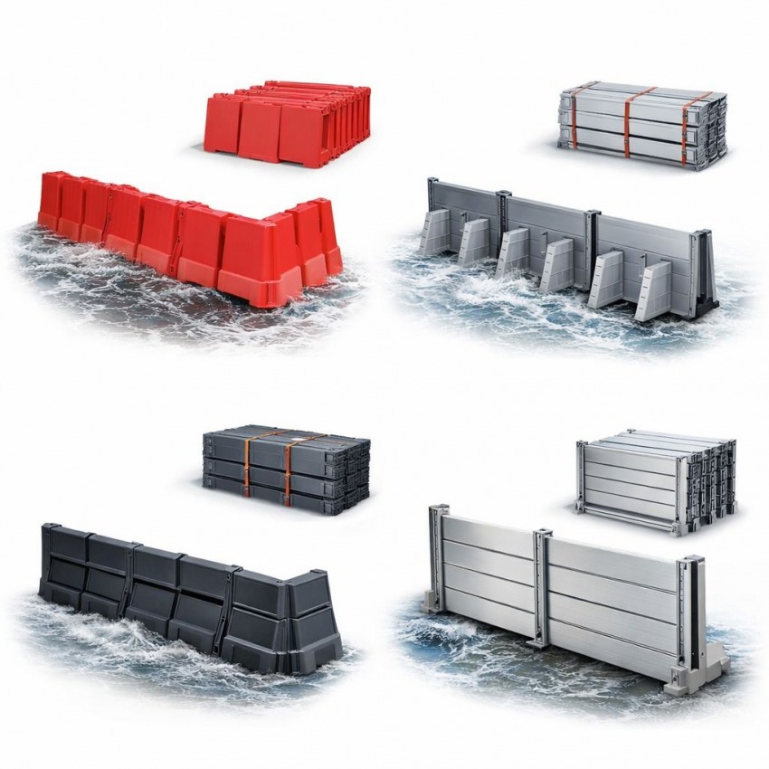 - plastikowe bariery przeciwpowodziowe (np. PP/ABS/kompozyty, moduły segmentowe, skrzynkowe, samostabilizujące),